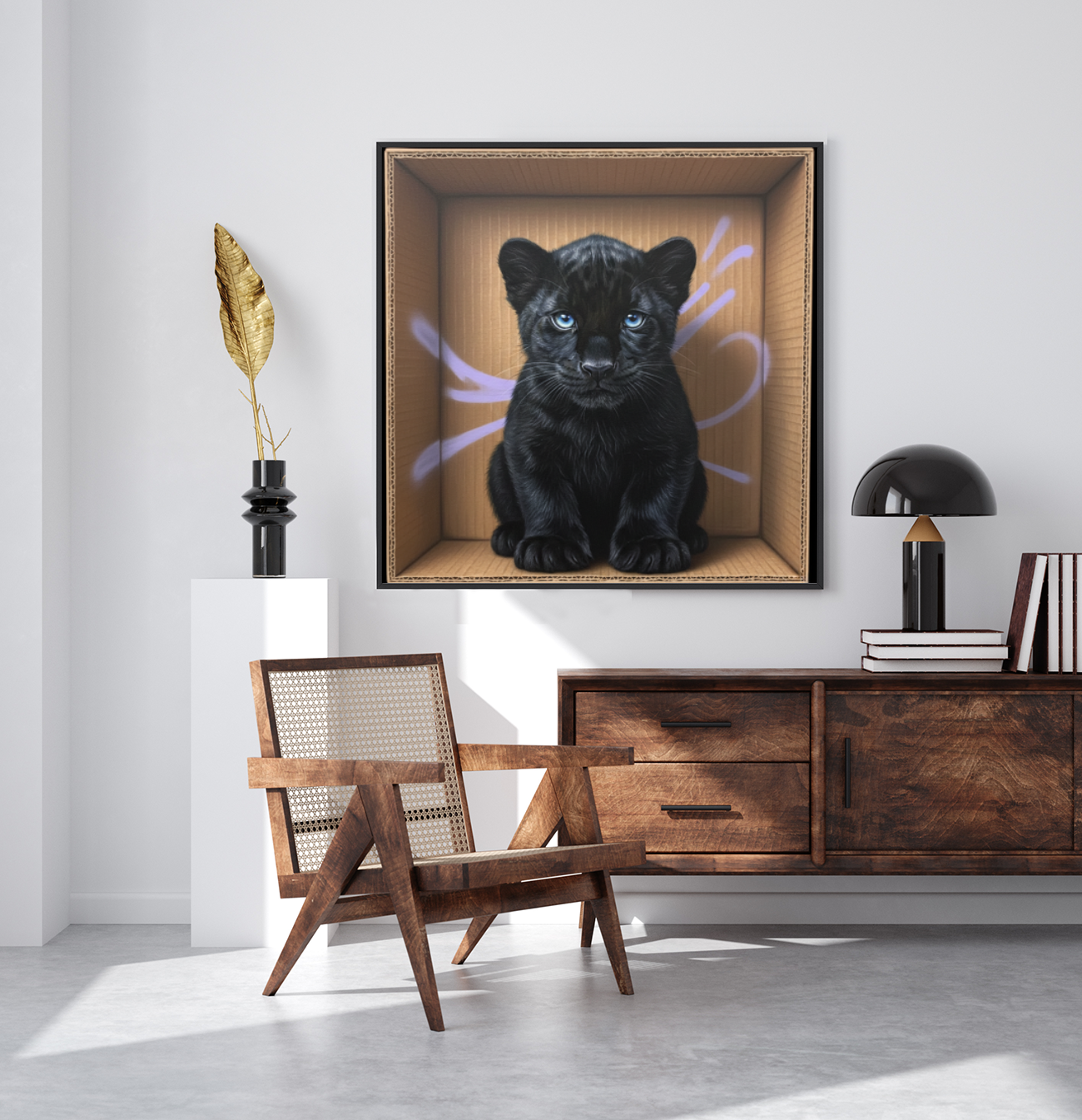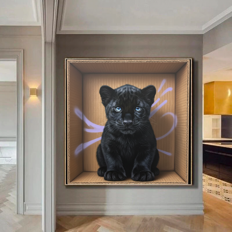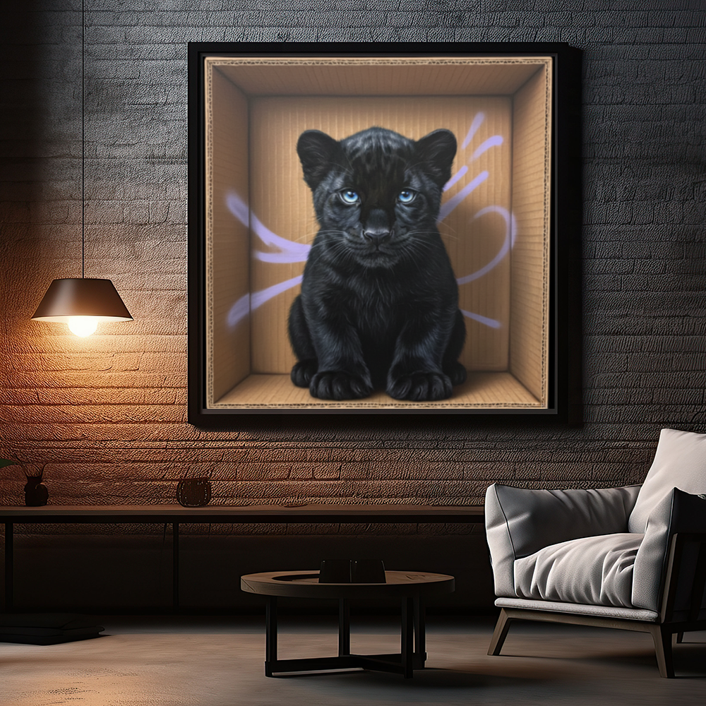 Ce tableau décoratif audacieux met en scène une jeune panthère noire aux yeux perçants, installée de façon saisissante à l'intérieur d'une boîte en carton. Type street-art réaliste, l'œuvre mélange avec brio la douceur animale et la rugosité urbaine, créant un contraste visuel aussi intrigant qu’unique. L’univers sauvage fusionne avec une touche d’art contemporain, pour une déco pleine de caractère et d’insolence. Une pièce originale qui capte l'attention et donne vie à n'importe quelle pièce.!